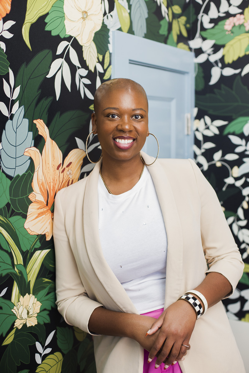 A professional portrait of Whitney Jones of Whitney J Decor, captured by Britt Smith Photography. Whitney stands confidently in a bright, inviting studio environment, embodying the expressive, personal, and color‑rich design philosophy she is known for. This image reflects the joyful, elevated, and client‑centered experience at the heart of her interior design studio in the Greater New Orleans area.