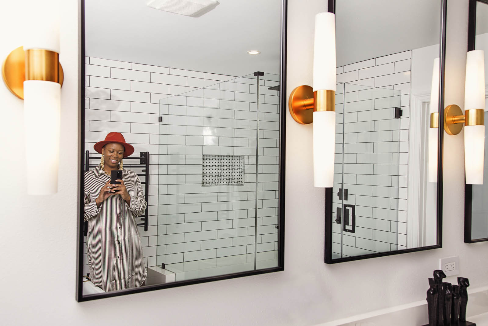 black and white primary bathroom by Whitney Jones of Whitney J Decor, interior designer in New Orleans | Black interior designer in New Orleans | eclectic interior designer in New Orleans | black interior design firm