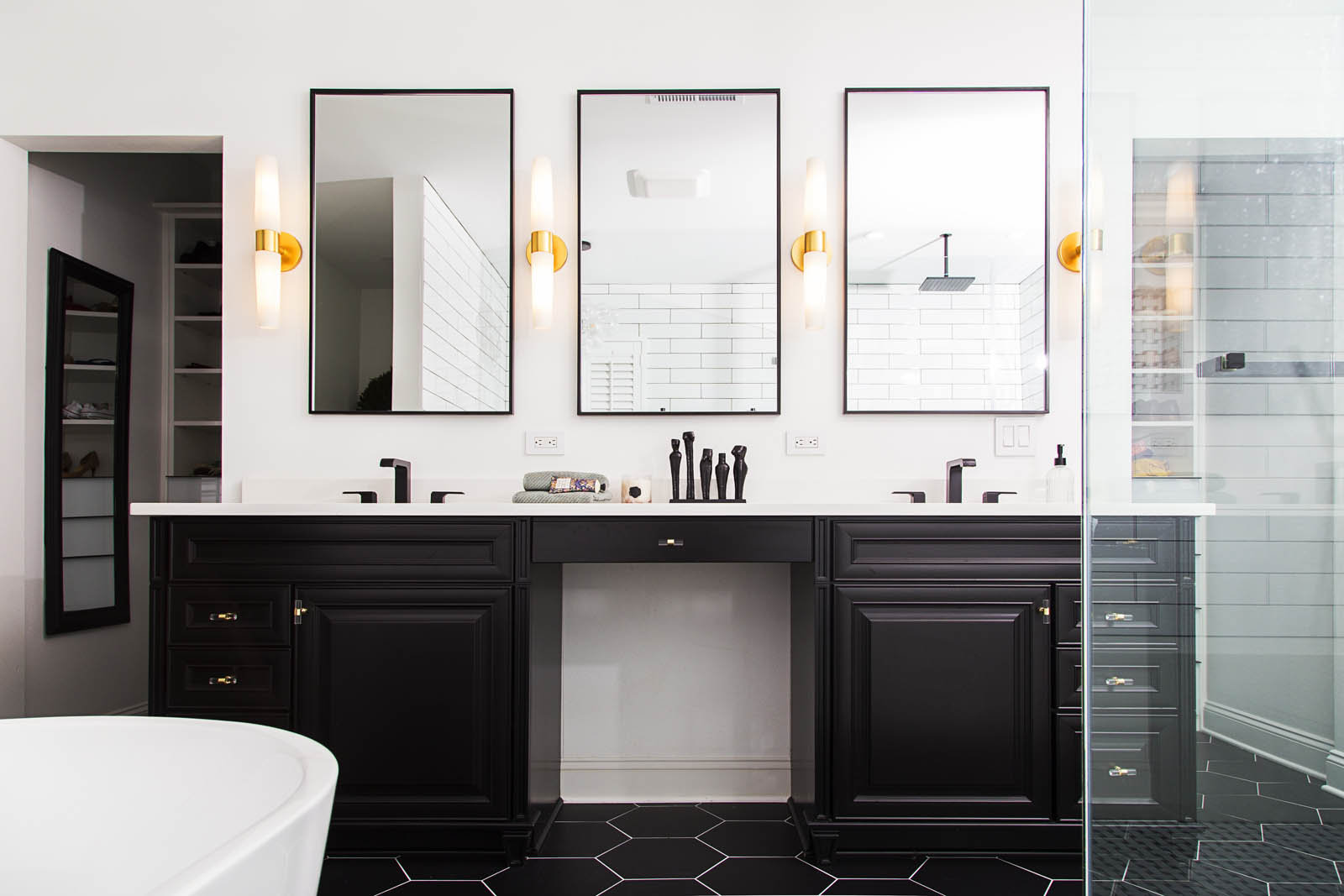 black and white primary bathroom by Whitney Jones of Whitney J Decor, interior designer in New Orleans | Black interior designer in New Orleans | eclectic interior designer in New Orleans | black interior design firm