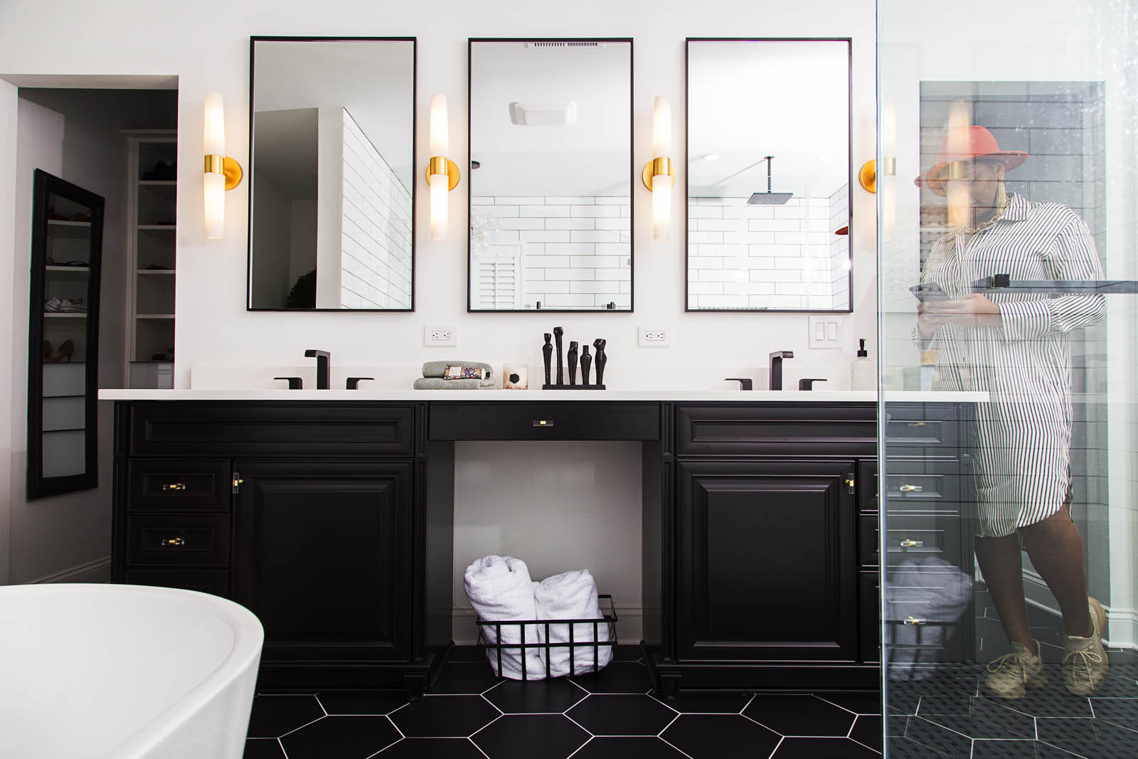 black and white primary bathroom by Whitney Jones of Whitney J Decor, interior designer in New Orleans | Black interior designer in New Orleans | eclectic interior designer in New Orleans | black interior design firm