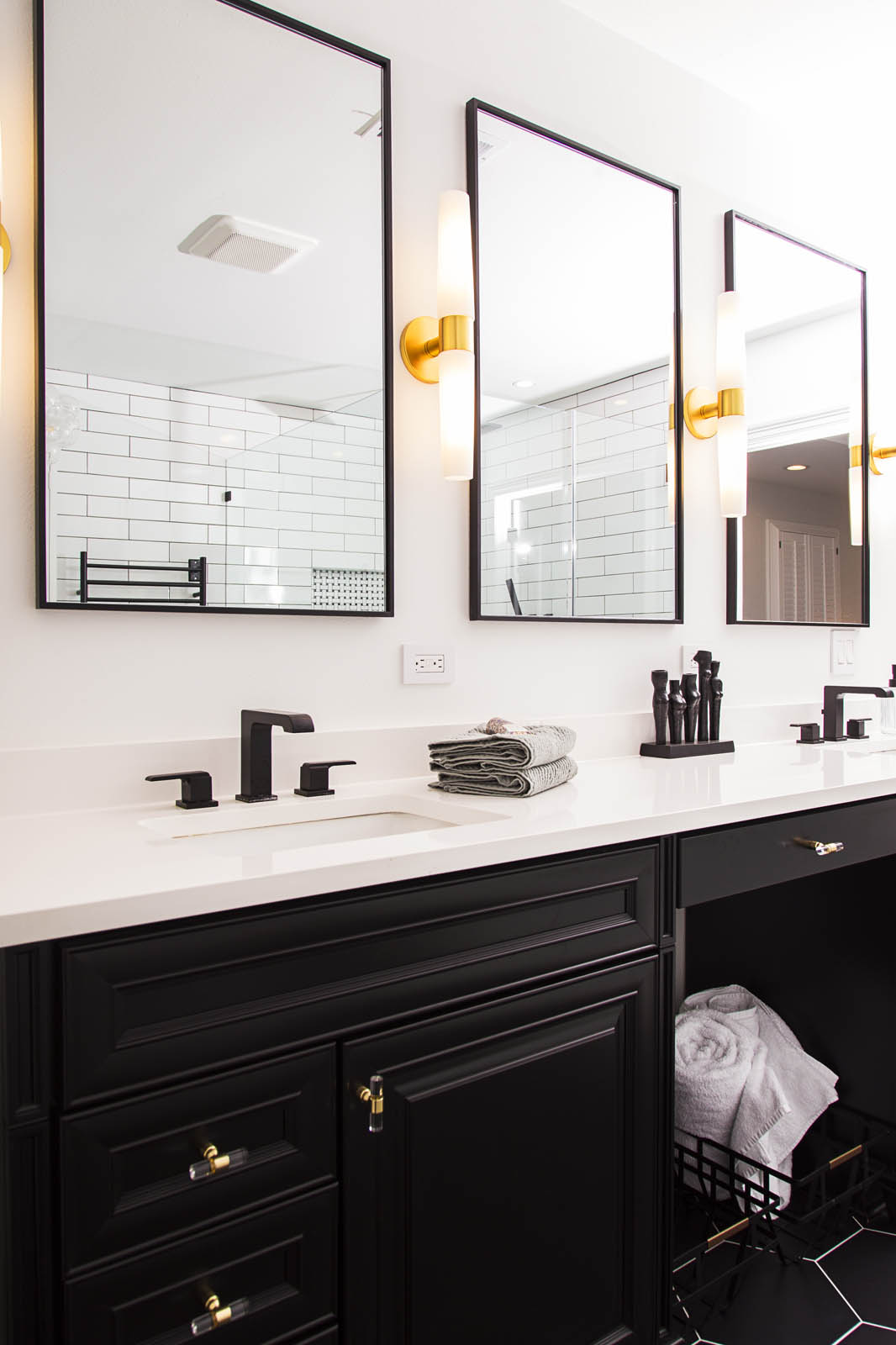 black and white primary bathroom by Whitney Jones of Whitney J Decor, interior designer in New Orleans | Black interior designer in New Orleans | eclectic interior designer in New Orleans | black interior design firm