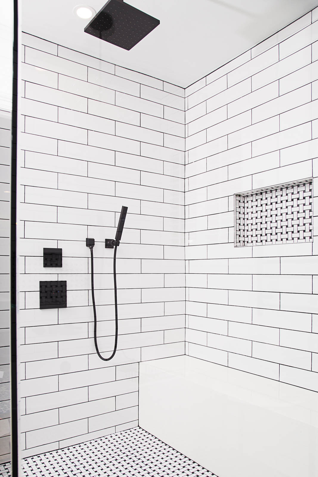 black and white primary bathroom by Whitney Jones of Whitney J Decor, interior designer in New Orleans | Black interior designer in New Orleans | eclectic interior designer in New Orleans | black interior design firm
