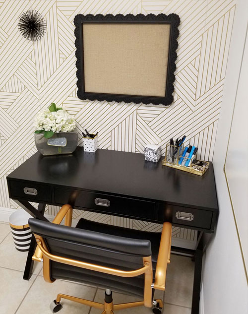 a black, white, and gold office transformation | glam office under 50 sqft | tiny office design | small office design | small home office | tiny home office | blue home office | whitney j decor