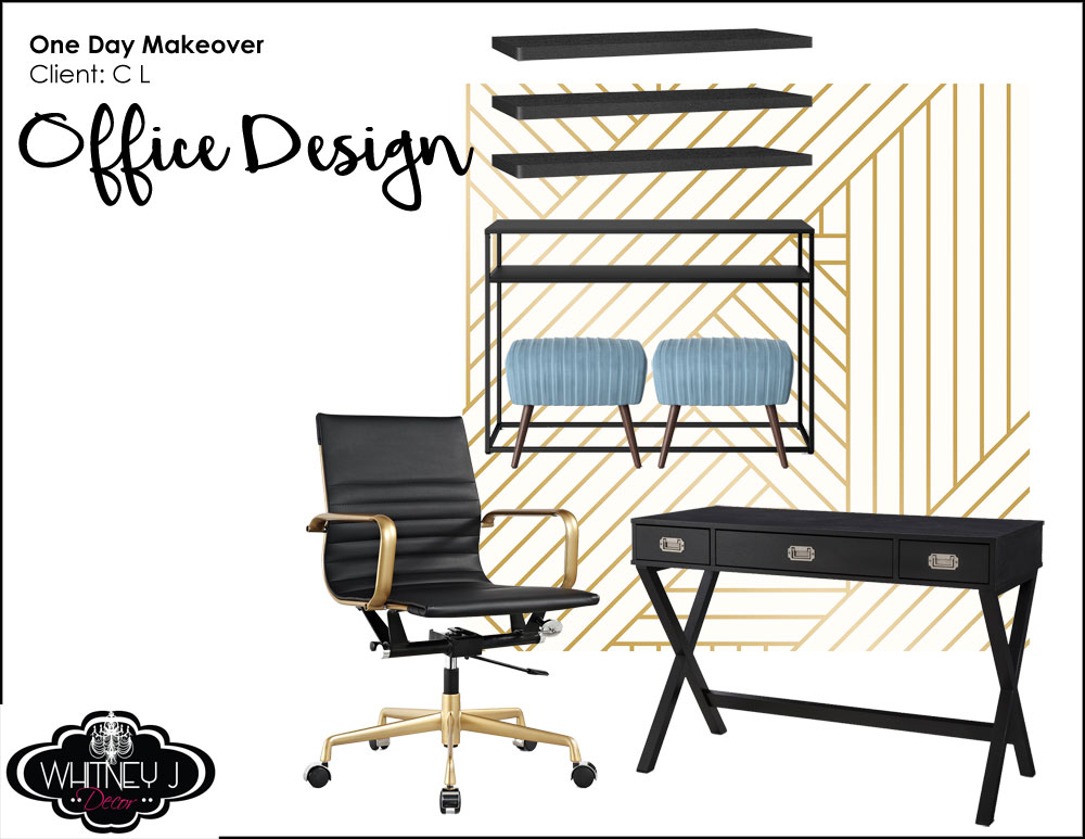 a black, white, and gold office transformation | glam office under 50 sqft | tiny office design | small office design | small home office | tiny home office | blue home office | whitney j decor