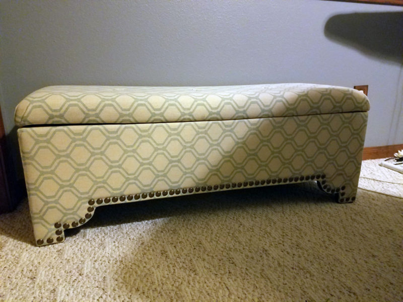 I grabbed this storage bench from Home Goods, and I’m recovering it with a graphic pattern. The lines are gorgeous and the oversized nailhead trim will be amazing with the updated fabric. More on that next week!