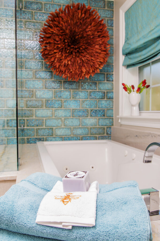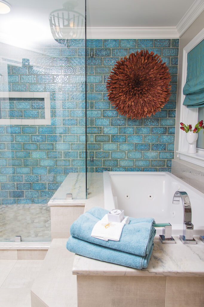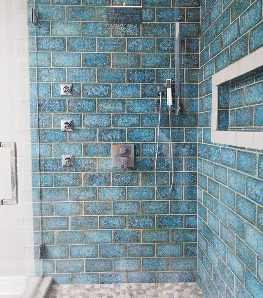 The bold blue tile is so different from what I typically source, as most of my clients have wanted neutral tile for their kitchens and baths. I love that the depth of color and the texture in these, because they really help ground this large shower and bath area. I’m soooooo happy my client agreed on with me on these!