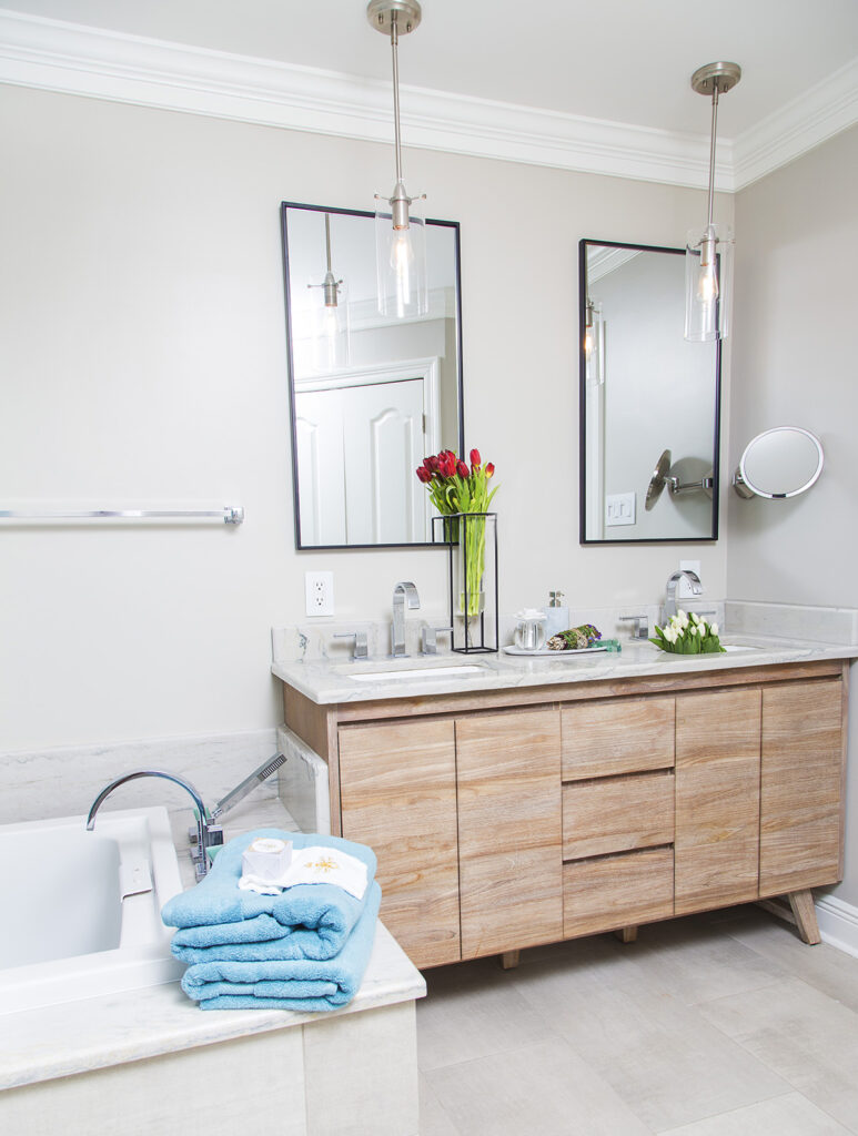 The previous built-in cabinets were way too wide for my clients’ needs, so I selected a free standing vanity, which cleared up space for a long soaker tub. Because the shower is so much larger, I opted to have the tub faucet closer to the tub entrance. Otherwise, my client would literally have to climb in the tub just to turn the water on.