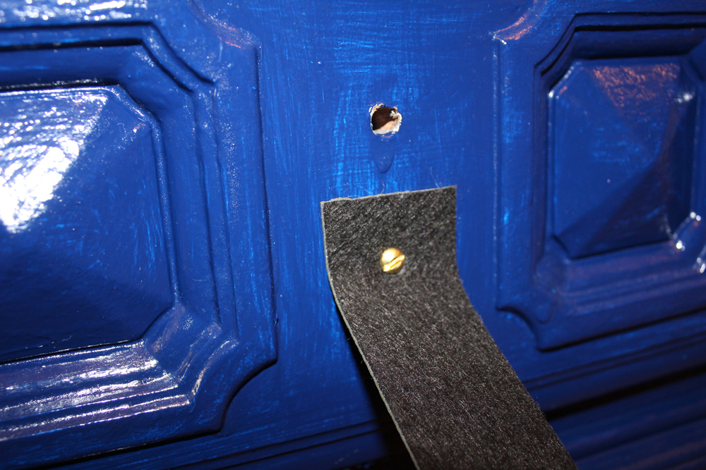 diy faux leather dresser handles | painted blue dresser | faux leather straps | bar cart | dining room