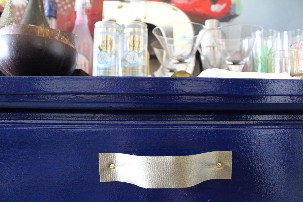 diy faux leather dresser handles | painted blue dresser | faux leather straps | bar cart | dining room