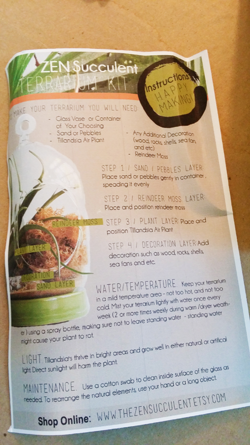 I’m so happy to be writing this post! I received a terrarium from the Zen Succulent on Etsy for review. To say I was excited, is a complete understatement. I’ve been wanting to start collecting succulents and air plants, for the longest, but plants I’ve bought from the past had a shorter life span than bacon on my breakfast plate (I love bacon)! The Zen Succulent has some of the most beautiful terrariums I’ve seen and their Etsy shop is full of gorgeous images of the different ones that they offer.