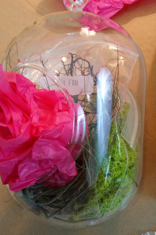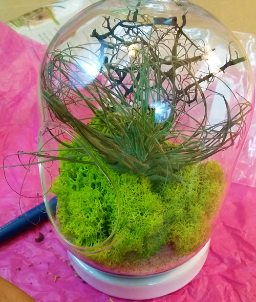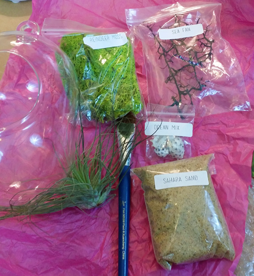 The directions were to then place in the Tillandsia air plant, and then the decorations (wood, rocks, seashells, sea fans, etc), but I found it easier to put my sea fan that came with the kit, first. See: