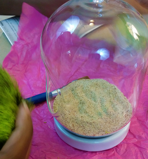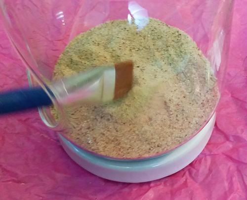 I used the small paint brush to brush off the sand off any unwanted areas of the inside of the glass. Then, I layered in the reindeer moss.