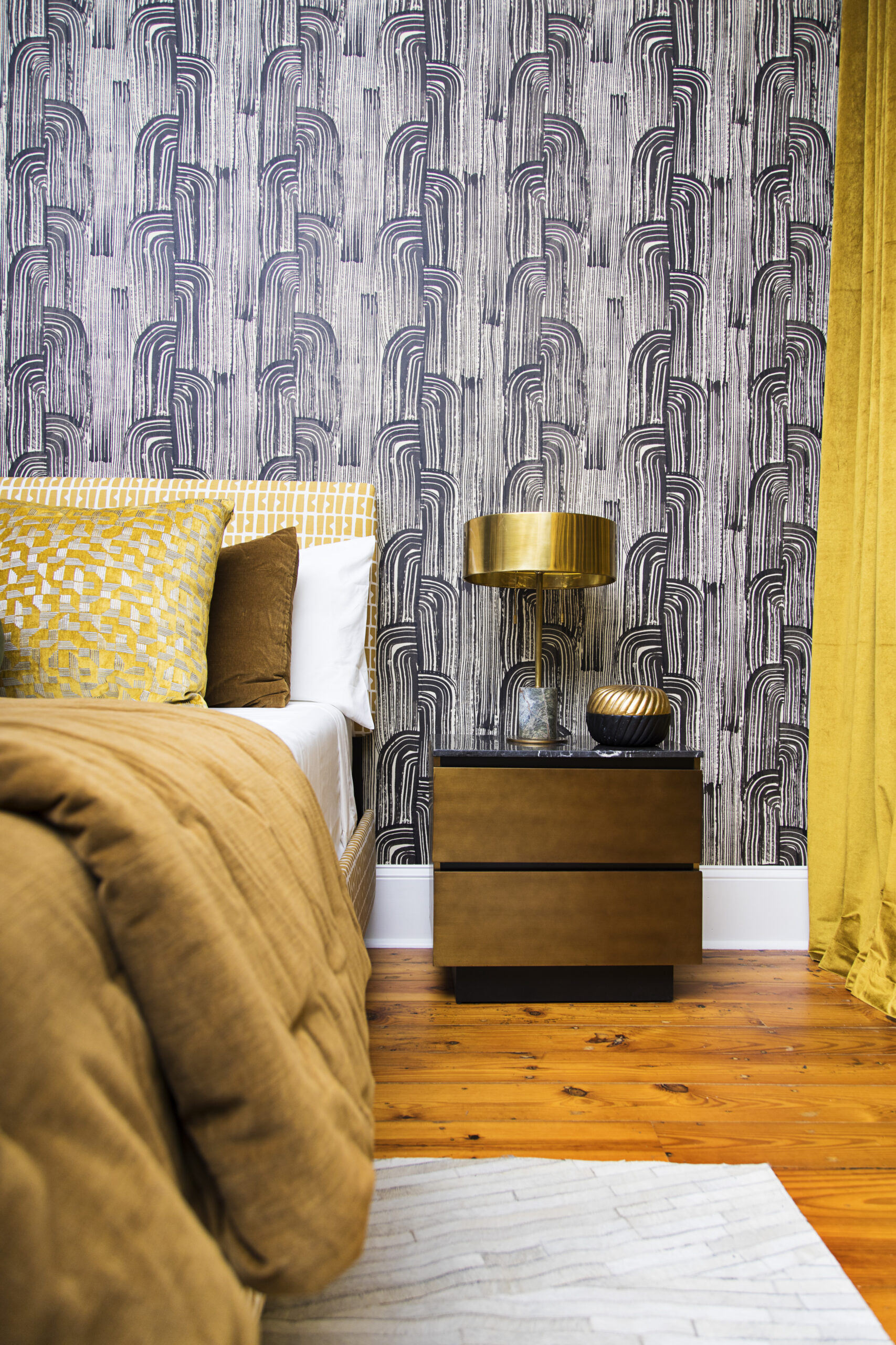 A modern, richly layered bedroom designed by Whitney Jones of Whitney J Decor featuring the iconic black and cream Kelly Wearstler Crescent wallpaper, a gold metal nightstand, and a sculptural gold‑shaded marble lamp. Warm bedding, natural textures, and curated styling create a sophisticated, contemporary retreat with bold pattern and luxe metallic details.