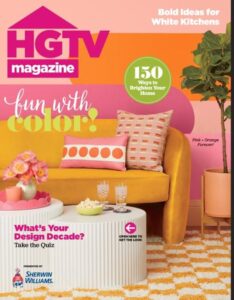 The HGTV Magazine cover showcases a vibrant living room styled in bold pink, orange, and yellow hues, with a mustard sofa, patterned pillows, a white ribbed coffee table, and colorful wall accents. This issue includes the digital feature “A Glam Kitchen in New Orleans,” highlighting Whitney J Decor’s signature use of color, sculptural details, and expressive design in a renovated New Orleans kitchen.
