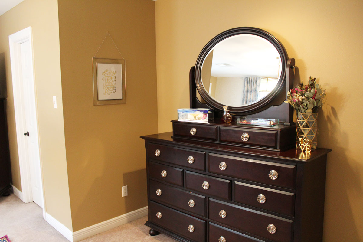 pink and blue transitional bedroom | blue bedroom | pink bedroom | transitional bedroom | glam bedroom | pink diy art | how to transform a master bedroom | white campaign dresser | blue chaise | nate berkus bedding