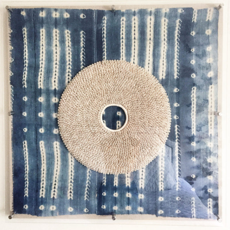 When I found her art on Instagram, I knew that I’d be saving all her pieces to my Pinterest wish list board. She does the most beautiful displays with shells and feathers. And, she pairs many of them with shibori! Y’all! If I didn’t think it was distasteful to start a GoFundMe for this, I’d really be advertising it right now. The mini cowrie shell piece below would be perfect in my living room! Can you picture it on my new green walls??